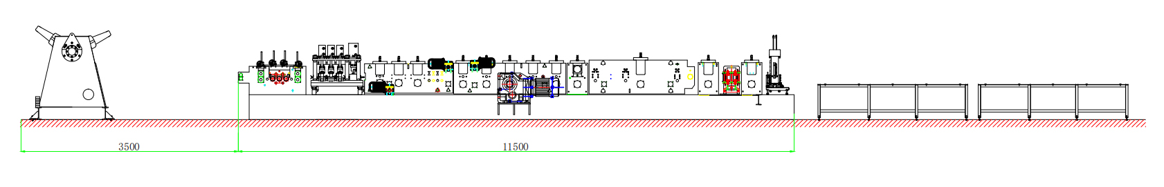 Decoiler → အစာကျွေးခြင်းနှင့် အဆင့်ညှိခြင်း ကိရိယာ → ဟိုက်ဒရောလစ် အကြိုဖြတ်တောက်ခြင်းနှင့် အပေါက်ဖောက်ခြင်း ကိရိယာ → လှိမ့်ခြင်း စနစ် → ဟိုက်ဒရောလစ် ဖြတ်တောက်ခြင်း → ထွက်ရန် ထိန်သိမ်း